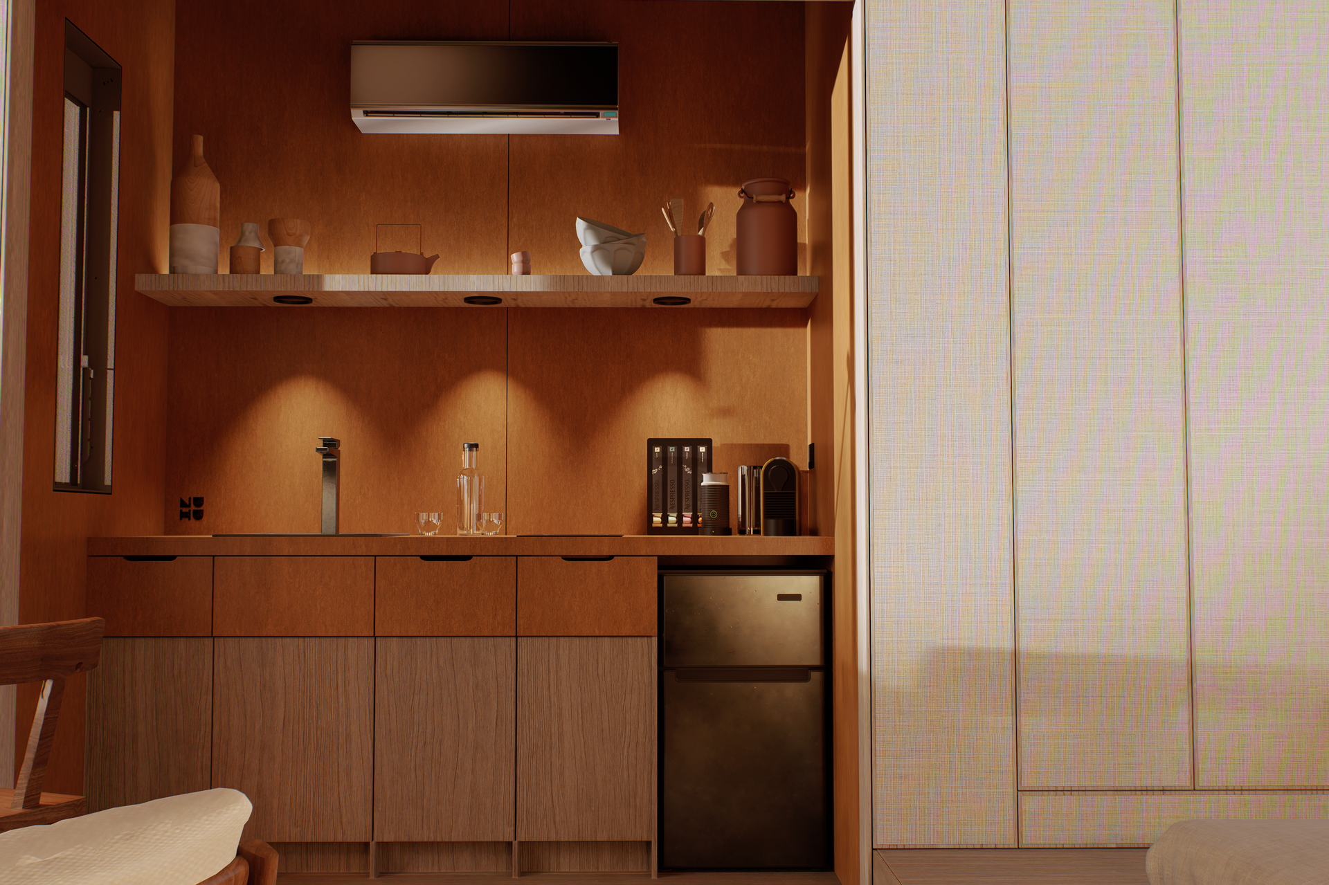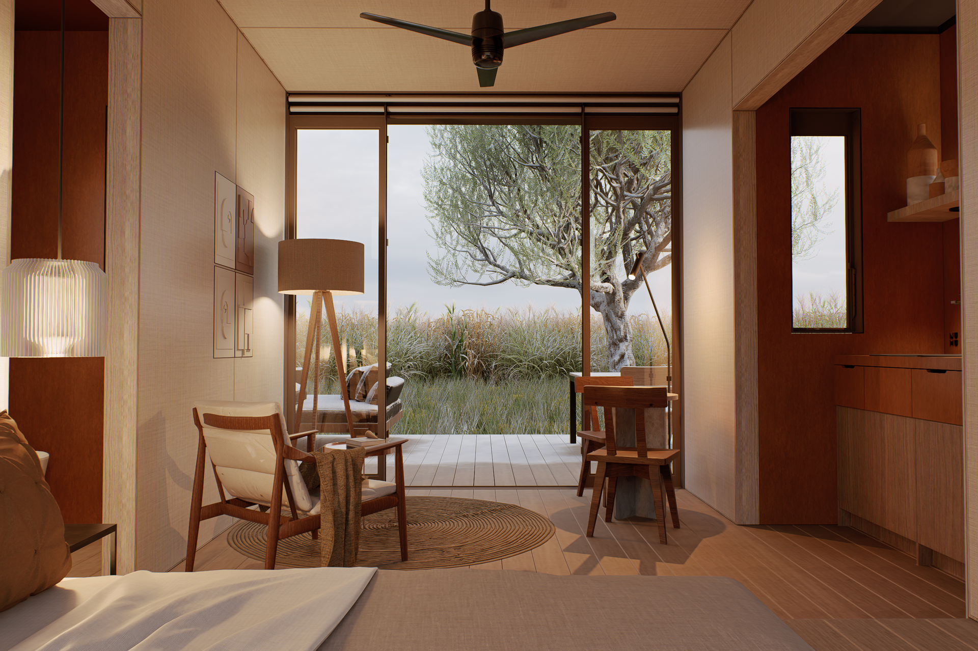 El interior de la Cross Cabin está pensado para el descanso profundo. Materiales naturales, iluminación suave y proporciones cuidadas crean un refugio silencioso que invita a habitar el tiempo sin prisa. Todo está reducido a lo esencial, garantizando confort.